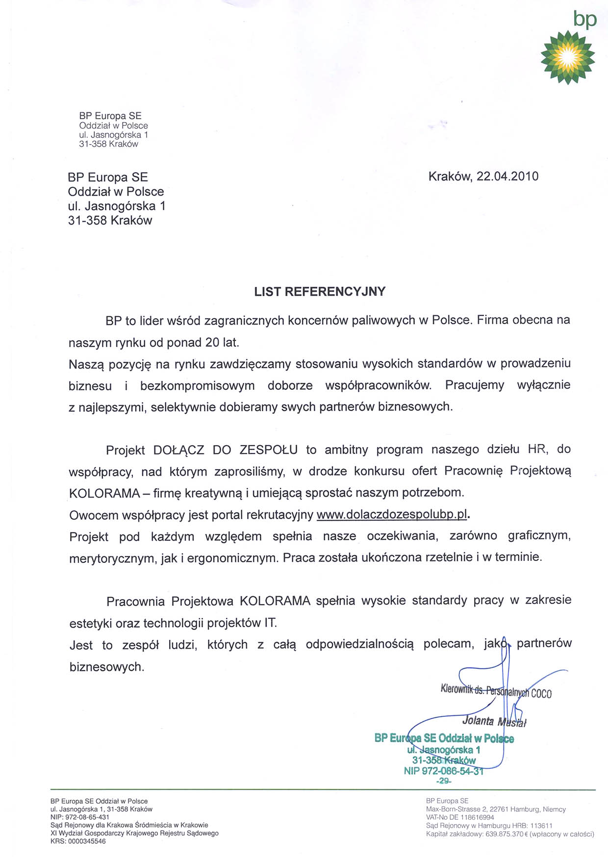 Pracownia Projektowa Kolorama wygrała konkurs na projekt i wdrożenie serwisu rekrutacyjnego BP. Na potrzeby projektu została przygotowana prosta witryna internetowa – narzędzie umożliwiające osobom zainteresowanym otrzymanie najważniejszych informacji – rekrutacje na jakie stanowiska aktualnie prowadzi Firma, jak również bezpośredni kontakt i możliwość zadawania pytań rekruterom.