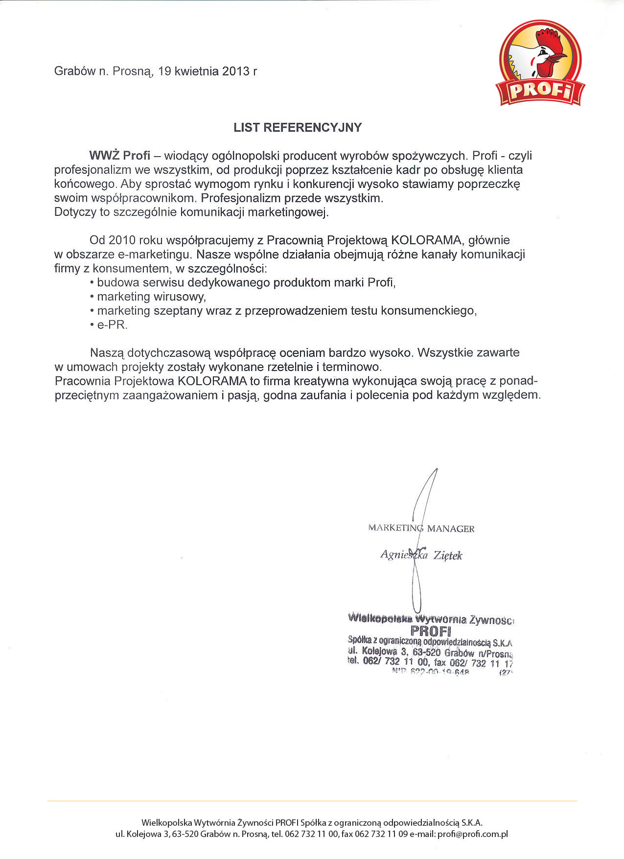 Współpraca z WWŻ Profi została zdefiniowana na płaszczyźnie webmarketingu i e-marketingu. Rozpoczęła się od projektu serwisu internetowego. Strona internetowa wizerunkowa z informacjami o Wytwórni i jej możliwościach oraz planach na przyszłość. Zakładka produktowa – krótko przedstawiająca portfel produktów.